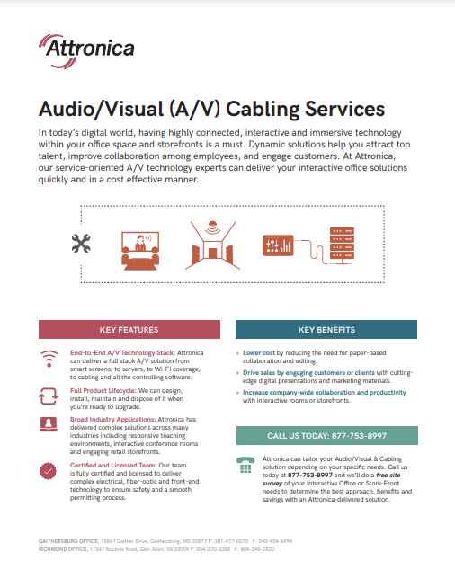 Attronica's AV solutions deliver numerous benefits to organizations, including increased sales, heightened brand awareness and enhanced employee engagement. By automating daily tasks and streamlining work environments, Attronica helps organizations achieve seamless virtual interactions, attract and retain top talent, and foster collaboration. Get a quote today and see how Attronica can elevate your business with cutting-edge AV technology.